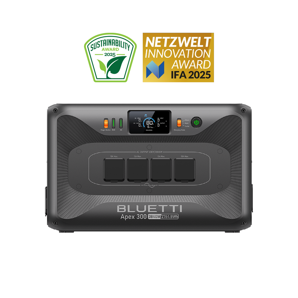 L’Apex 300 fournit une puissance de sortie AC continue de 3 840 W à 230 V (pic de 7 680 W), alimentant facilement les réfrigérateurs, plaques à induction, outils électriques ou climatiseurs.