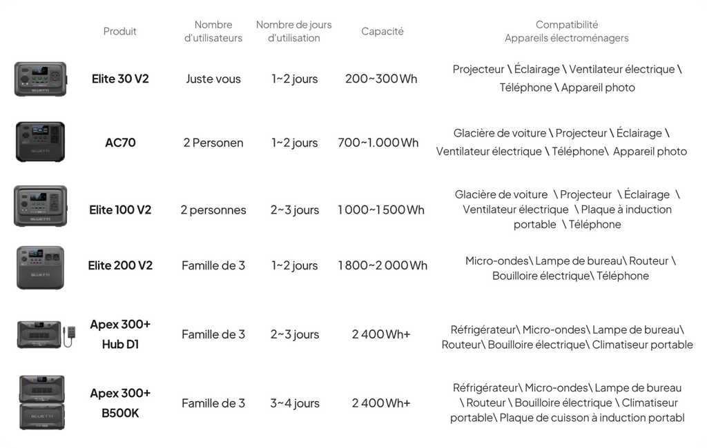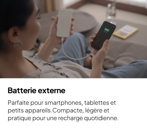 Smartphones, tablettes, ordinateurs portables Appareils photo, drones et routeurs Wi-Fi Lampes LED, ventilateurs, couvertures électriques Petits appareils comme un mini-réfrigérateur, une cafetière ou un appareil CPAP Équipements de camping, camping-car ou pour les urgences La performance réelle dépend de la capacité de la batterie (Wh) et du nombre d’appareils utilisés simultanément. -