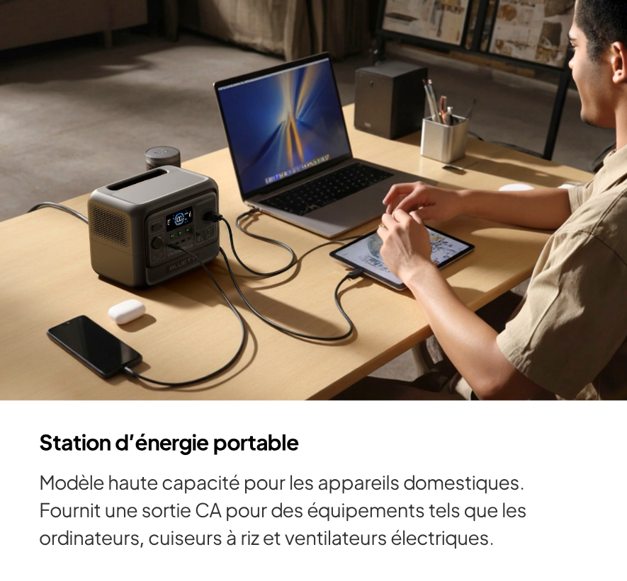 Conçues pour être sûres, fiables et polyvalentes, les stations d’énergie portables BLUETTI intègrent une batterie LiFePO₄, un onduleur à onde sinusoïdale pure et un système de gestion intelligent (BMS) pour fournir une énergie stable en toutes circonstances. Grâce à leurs multiples ports, elles répondent à tous vos besoins énergétiques, à la maison comme en déplacement.