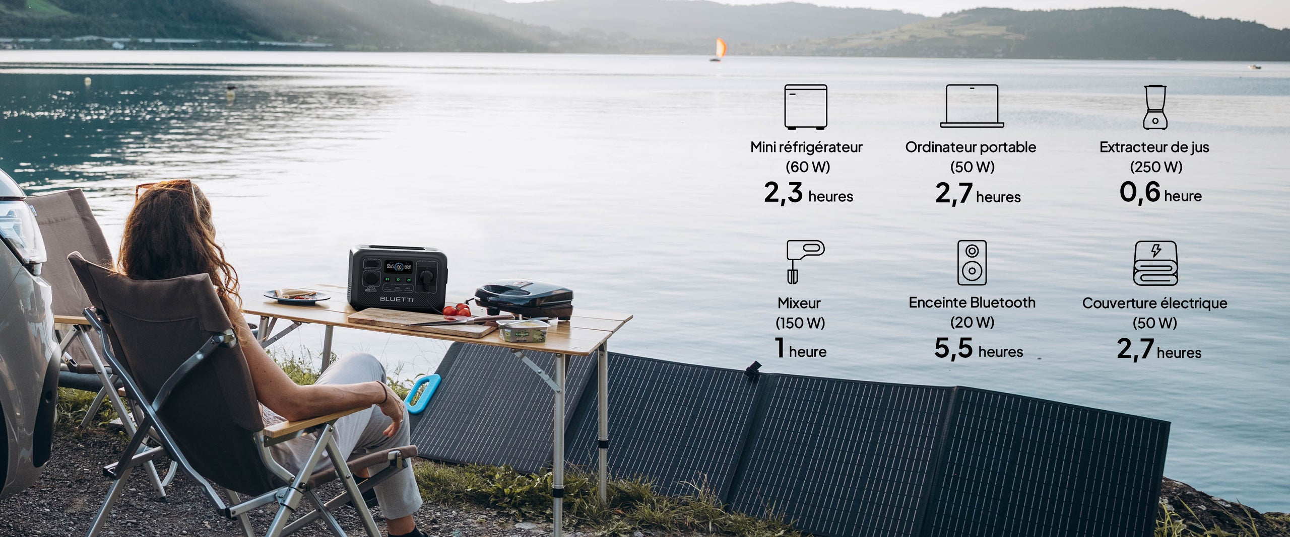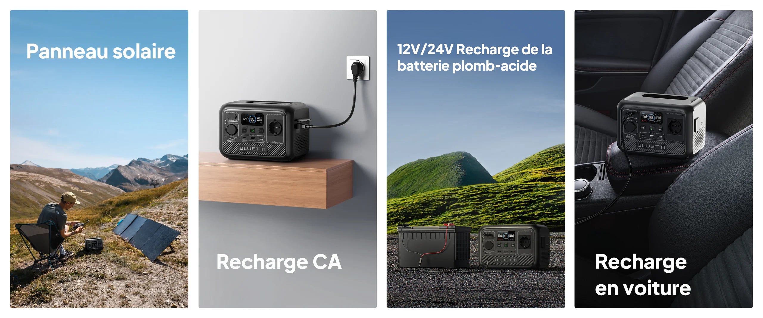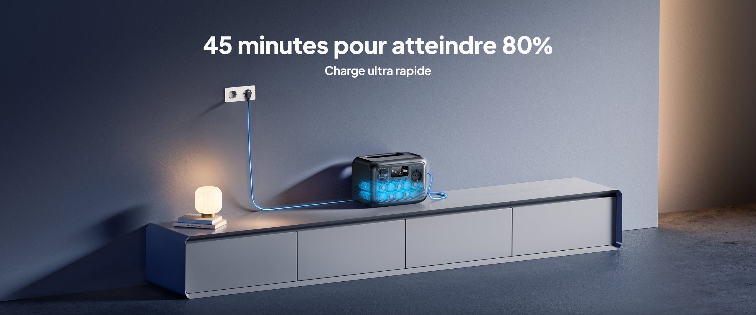 A:AC2A prend en charge jusqu'à 270 W d'entrée en courant alternatif. Branchez-le sur une prise murale et activez le mode de charge turbo sur l'application BLUETTI, et vous pourrez le remplir en seulement 1,2 heure.