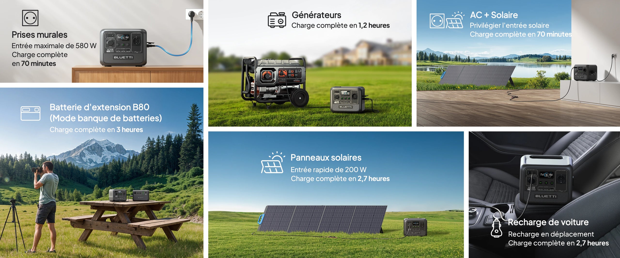 Solaire du jour: rechargez pendant la journée avec des panneaux solaires, vous permettant d'alimenter vos appareils tout en rechargeant simultanément la batterie.