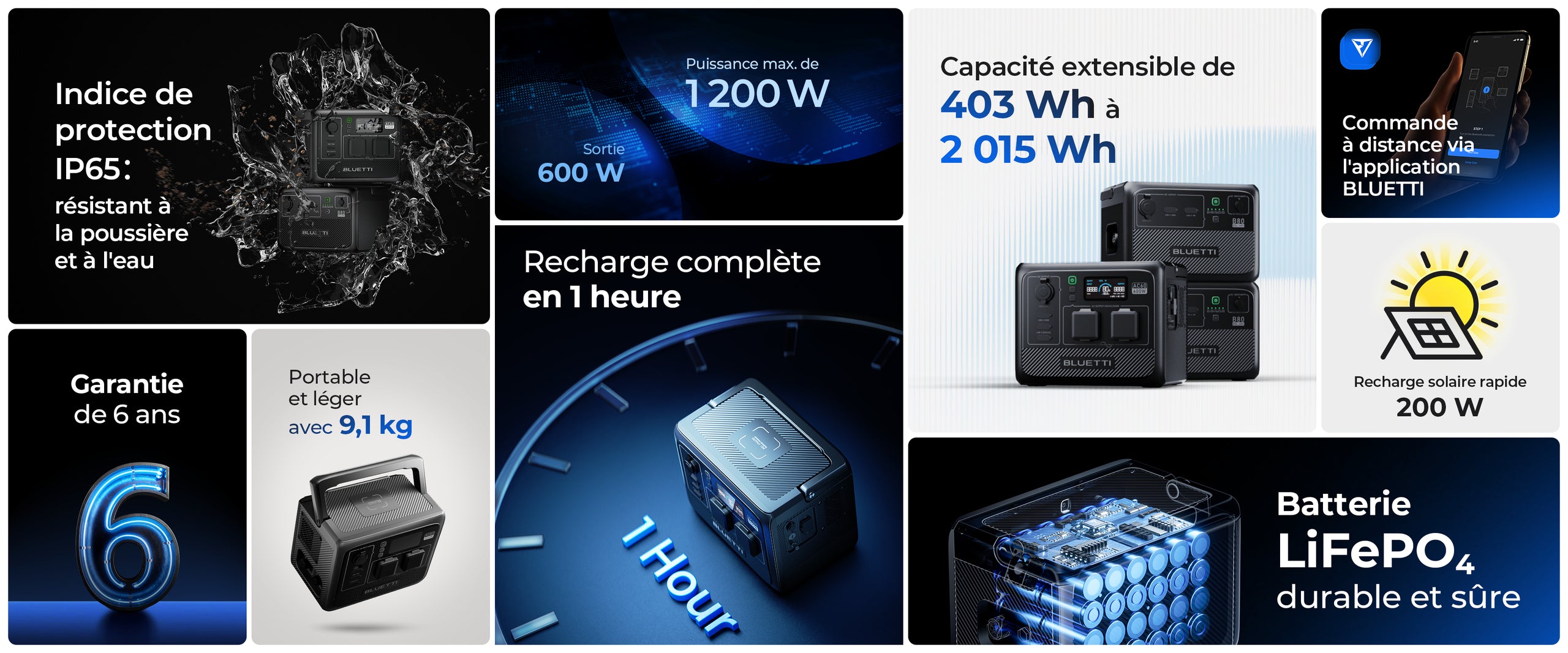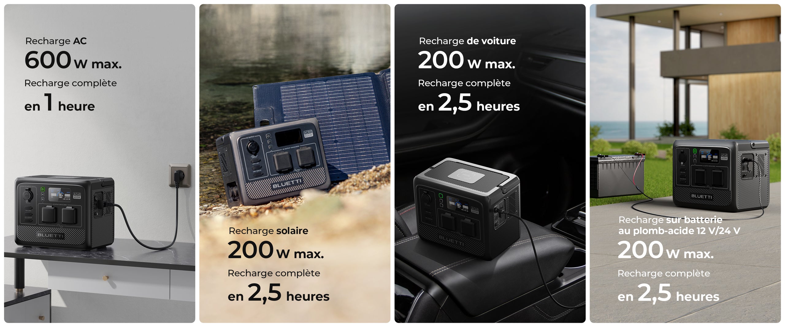 R:L'AC60 prend en charge une entrée maximale de 600 W. Branchez-la sur une prise murale, activez le mode de recharge turbo sur l'application BLUETTI et vous pouvez la recharger en 1,2 à 1,7 heure.