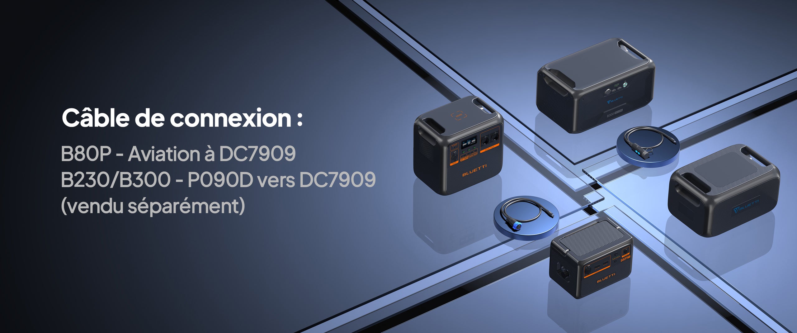 R:Actuellement, l'AC180P prend en charge l'extension de capacité avec des batteries B80, B230 ou B300. Pour brancher les batteries B80, vous aurez besoin du câble Aviation vers DC7909* (Vendu séparément), tandis que le câble P090D est nécessaire pour les batteries B230/B300 (Vendu séparément). Assurez-vous que les batteries sont en mode Power Bank.