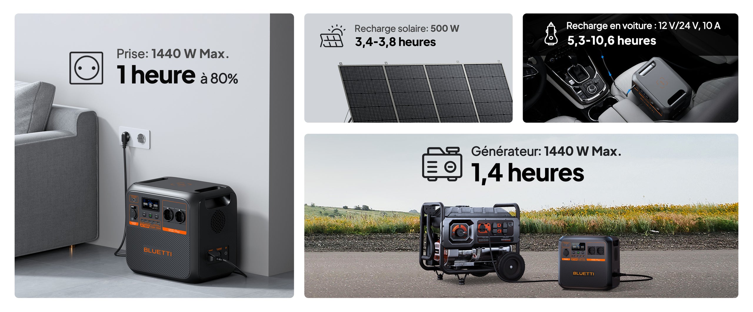 R:L'AC180P prend en charge une entrée de 1 440 W maximum. Branchez-la sur une prise murale, activez le mode de recharge turbo sur l'application BLUETTI et vous pouvez la recharger en 1,3 à 1,8 heure seulement.