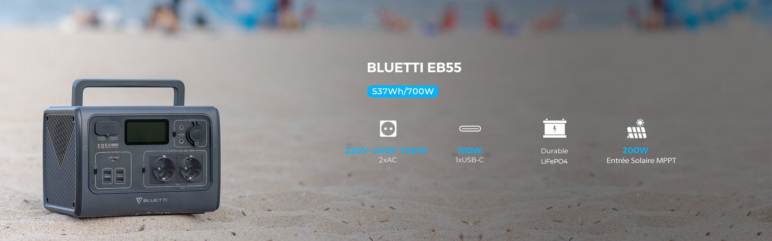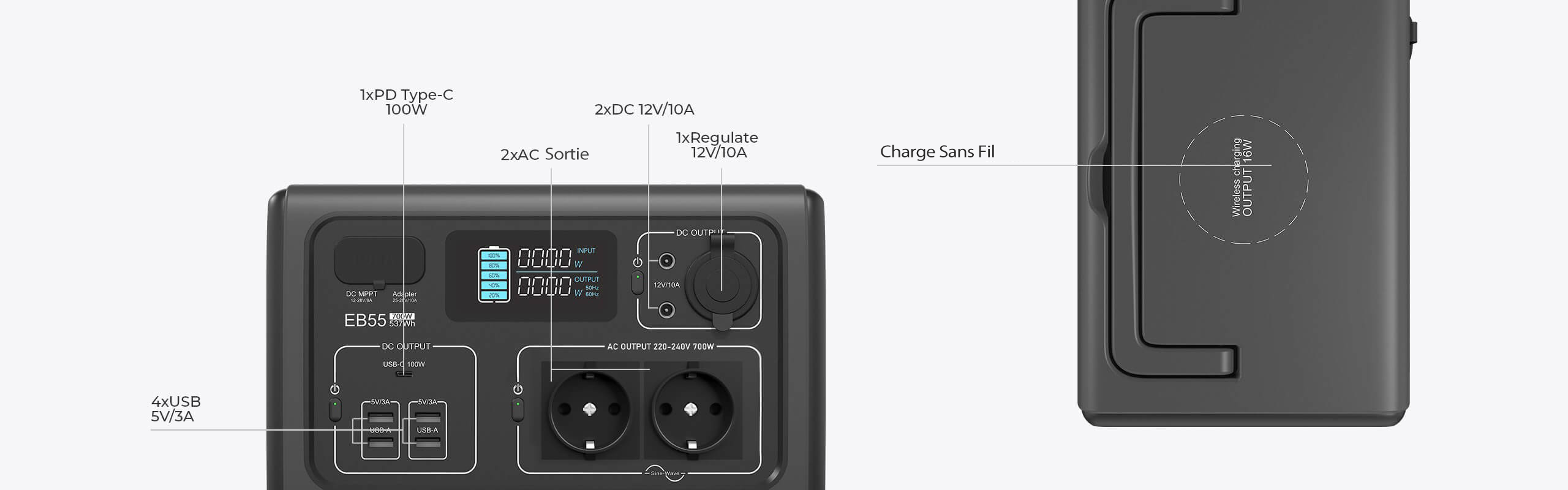 R:Veuillez noter que les ports de sortie CA peuvent charger/alimenter les appareils uniquement à moins de 700 watts, et la puissance totale doit également être inférieure à 700 watts, sinon l'EB55 s'éteindra automatiquement pour la protection du circuit. Veuillez-vous assurer que votre appareil est compatible avec EB55 avant l'achat. De plus, Pour certains appareils avec moteur/compresseur intégré, la puissance de démarrage instantanée peut être 2 à 4 fois supérieure à la puissance nominale, qui peut dépasser la limite supérieure de l'EB55.