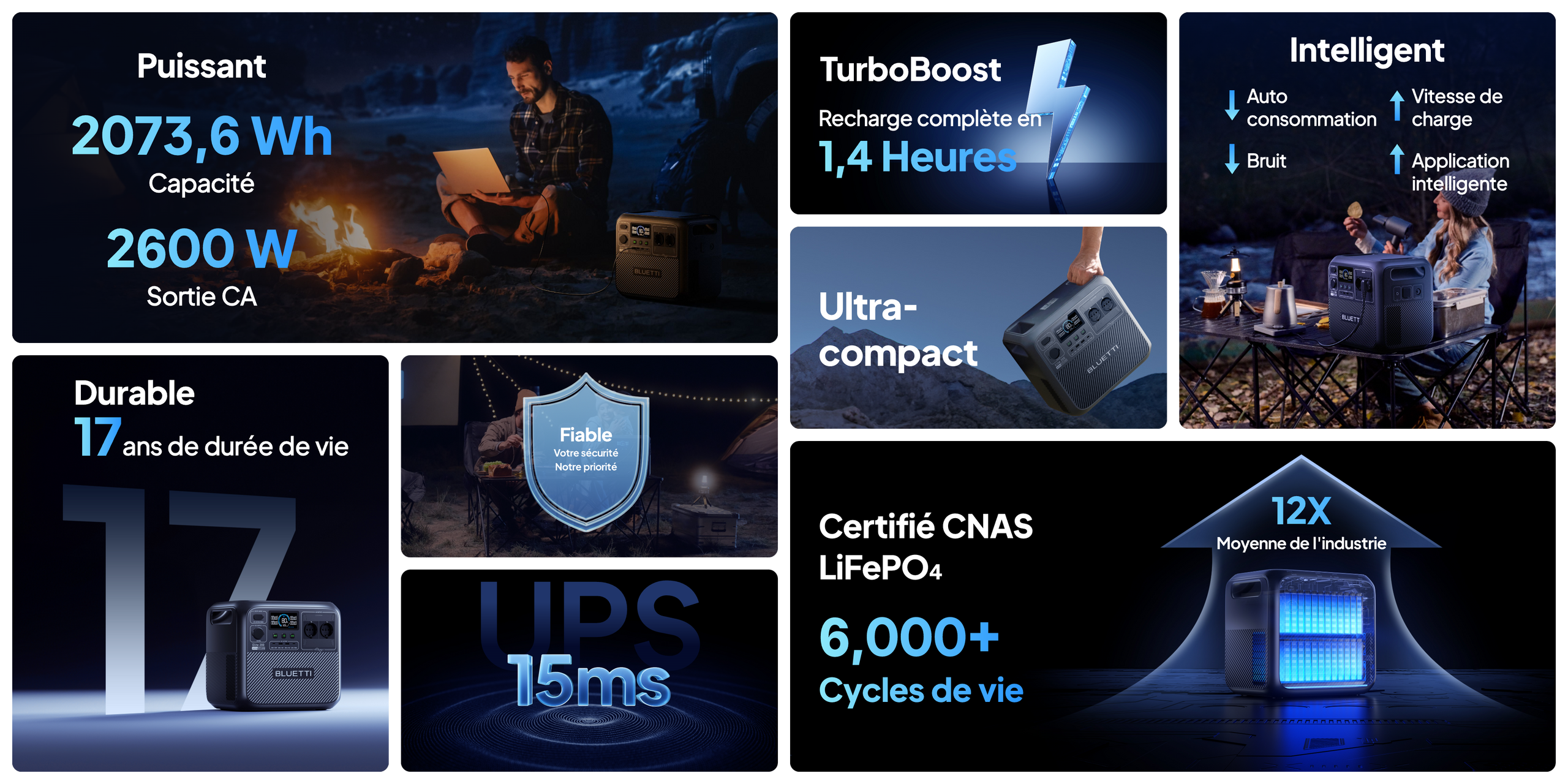 Elite 200 V2 est équipé de la première batterie LFP de qualité automobile certifiée CNAS de l'industrie, qui répond à 33 normes rigoureuses en matière de batteries automobiles. Cette certification garantit des performances exceptionnelles en matière de capacité de charge/décharge, de récupération de la capacité, de résistance aux vibrations, de protection contre la surcharge/décharge, de sécurité contre les courts-circuits externes, d'endurance à haute température et de durée de vie.