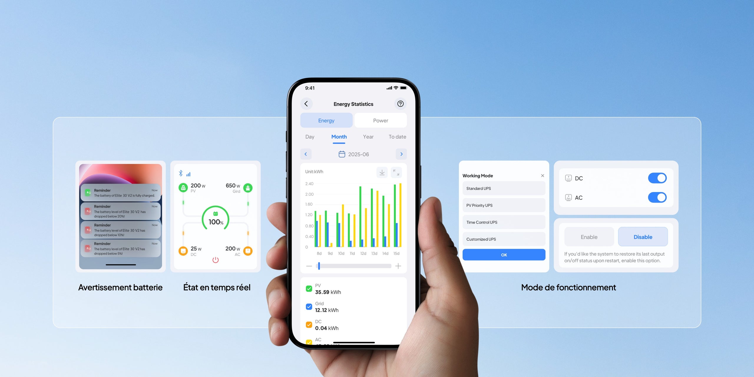 Autonomie estimée = Capacité totale de la batterie × Profondeur de décharge (DoD) × Rendement de l'onduleur (η) ÷ (Puissance nominale de l'appareil + Consommation propre de l'Elite 30 V2)