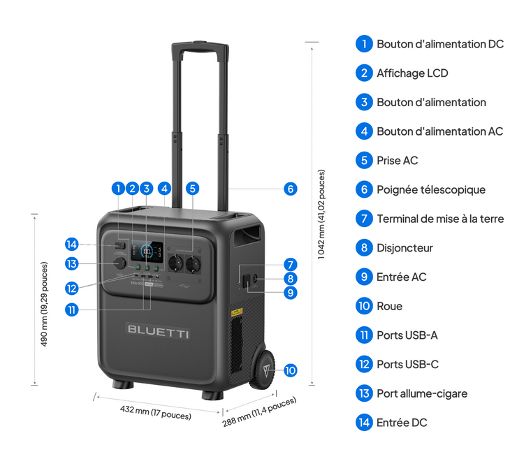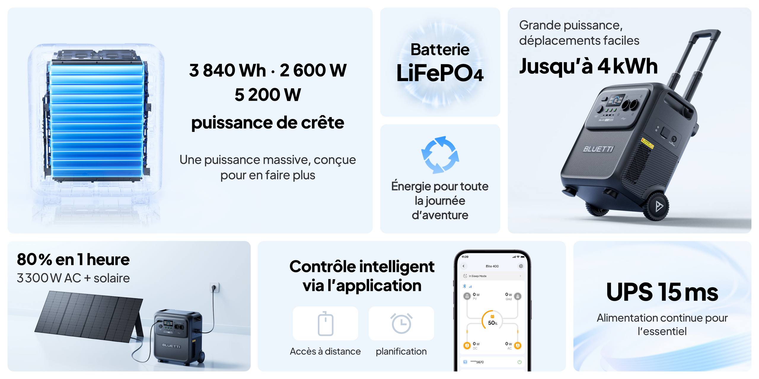 A:Grâce à sa capacité de 3,84 kWh et sa puissance de 2 600 W, l'Elite 400 est doté d'une poignée télescopique et de roues pour une mobilité facile. Il est parfait pour :