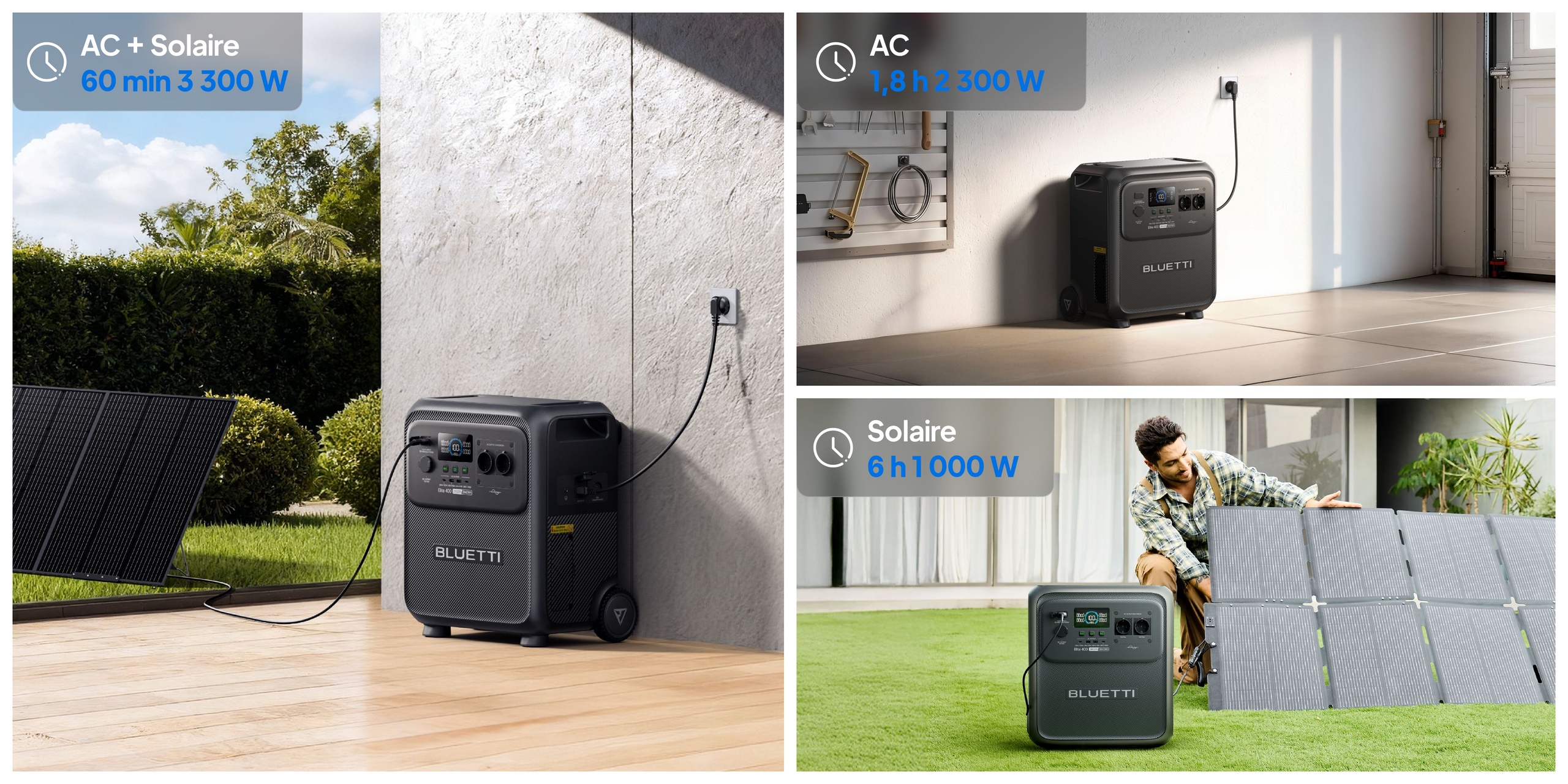 AC + Solaire 2 800 W : 80 % en 70 minutes, plein en 1,8 heures