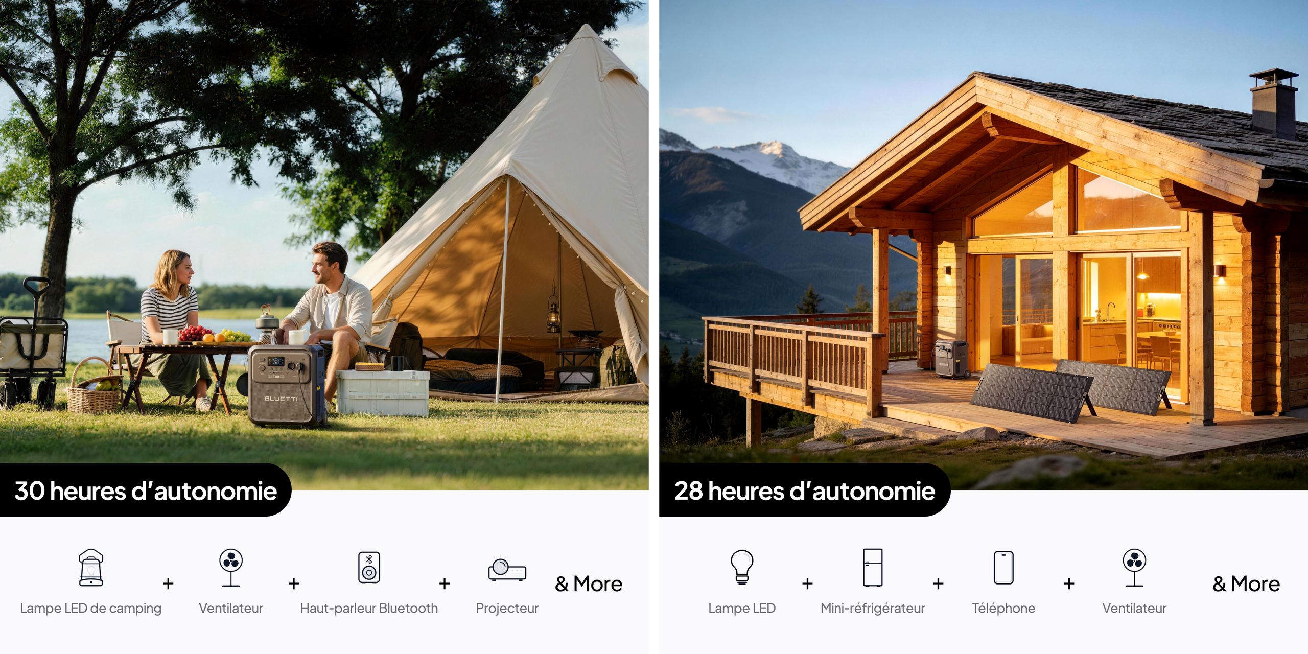 Donnez vie à votre camp. Alimentez votre cuisine extérieure, vos lumières et vos soirées cinéma — le tout dans le confort silencieux d’une énergie propre sous les étoiles.