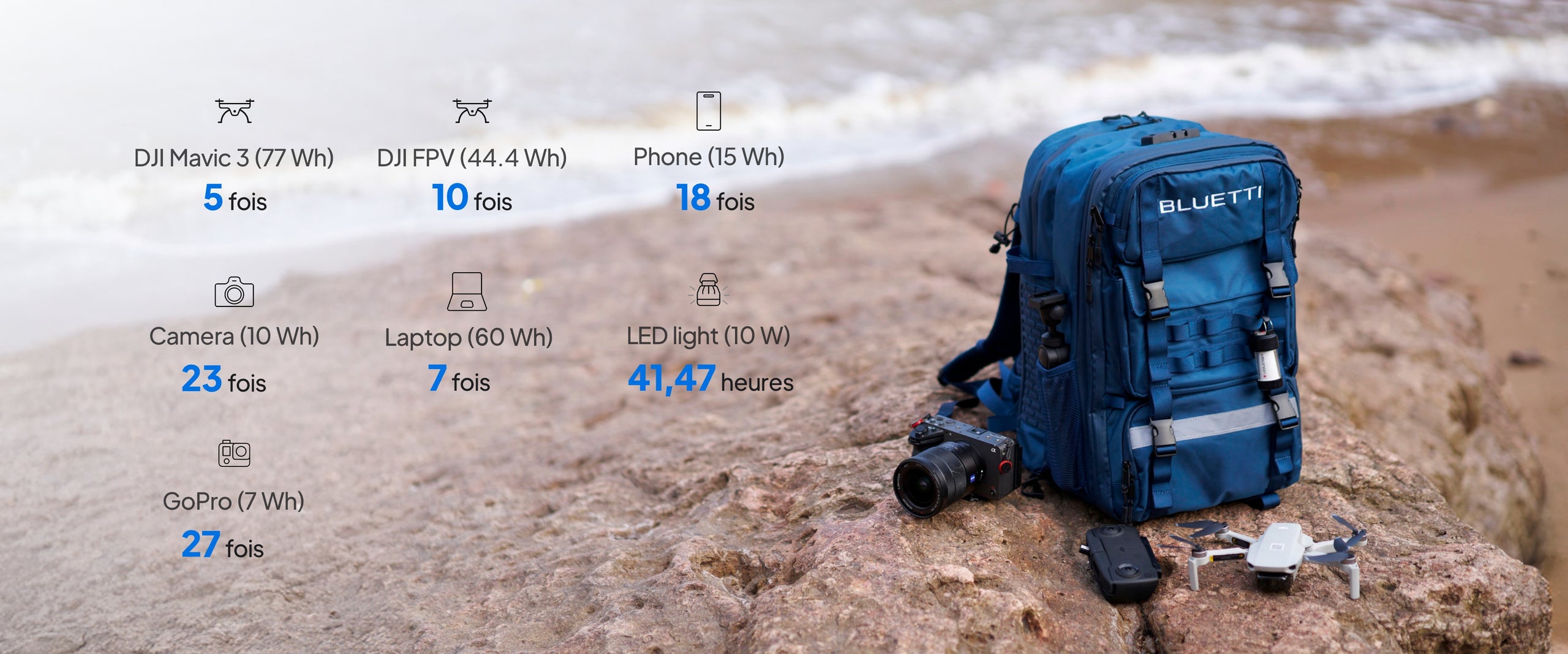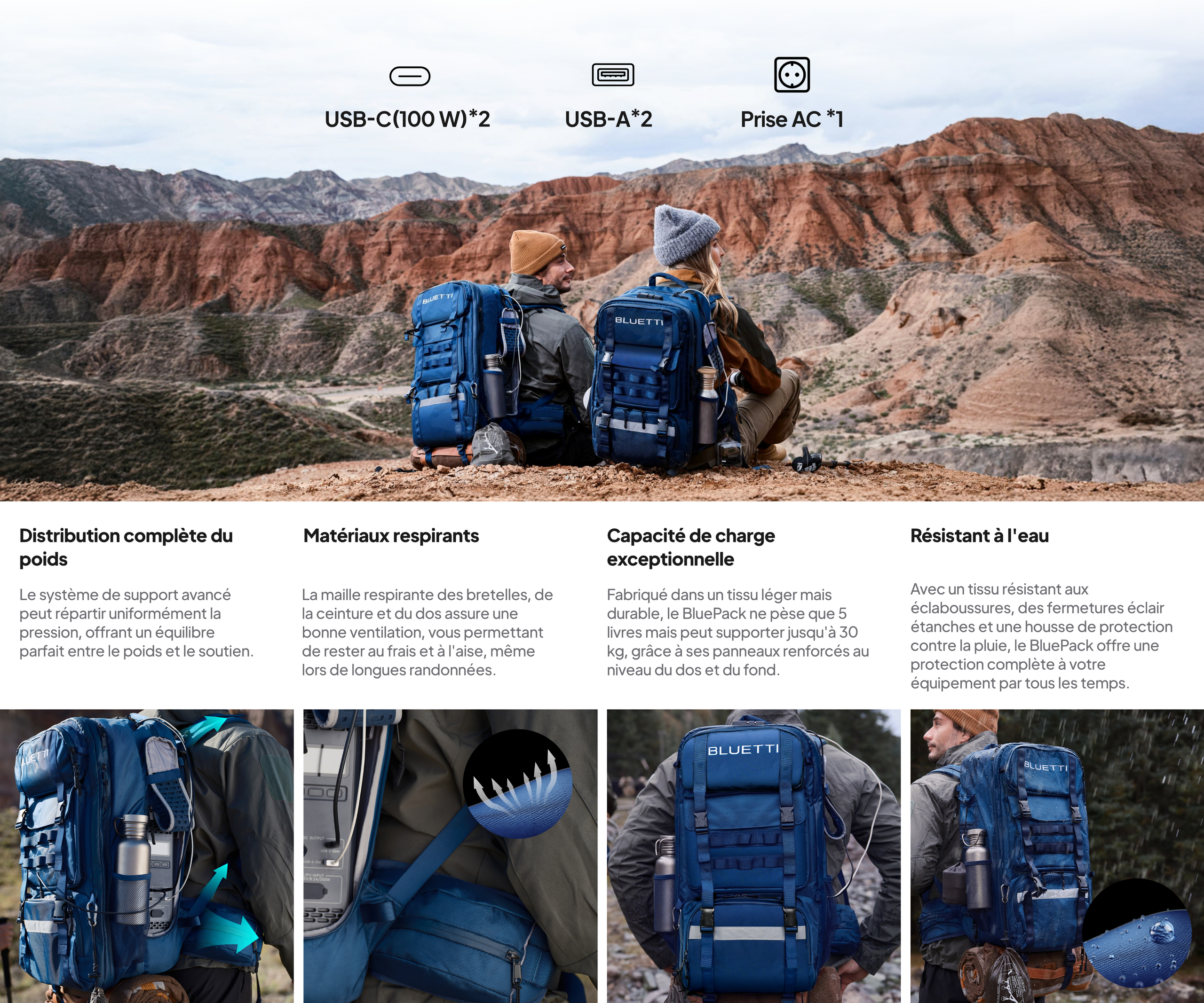 Le cadre de support et la base robustes offrent une protection solide, tandis que la conception étroitement enveloppée avec un rembourrage supplémentaire absorbe efficacement les chocs pendant les mouvements. Le BluePack peut répondre à tous vos besoins de stockage et d'alimentation en extérieur. -