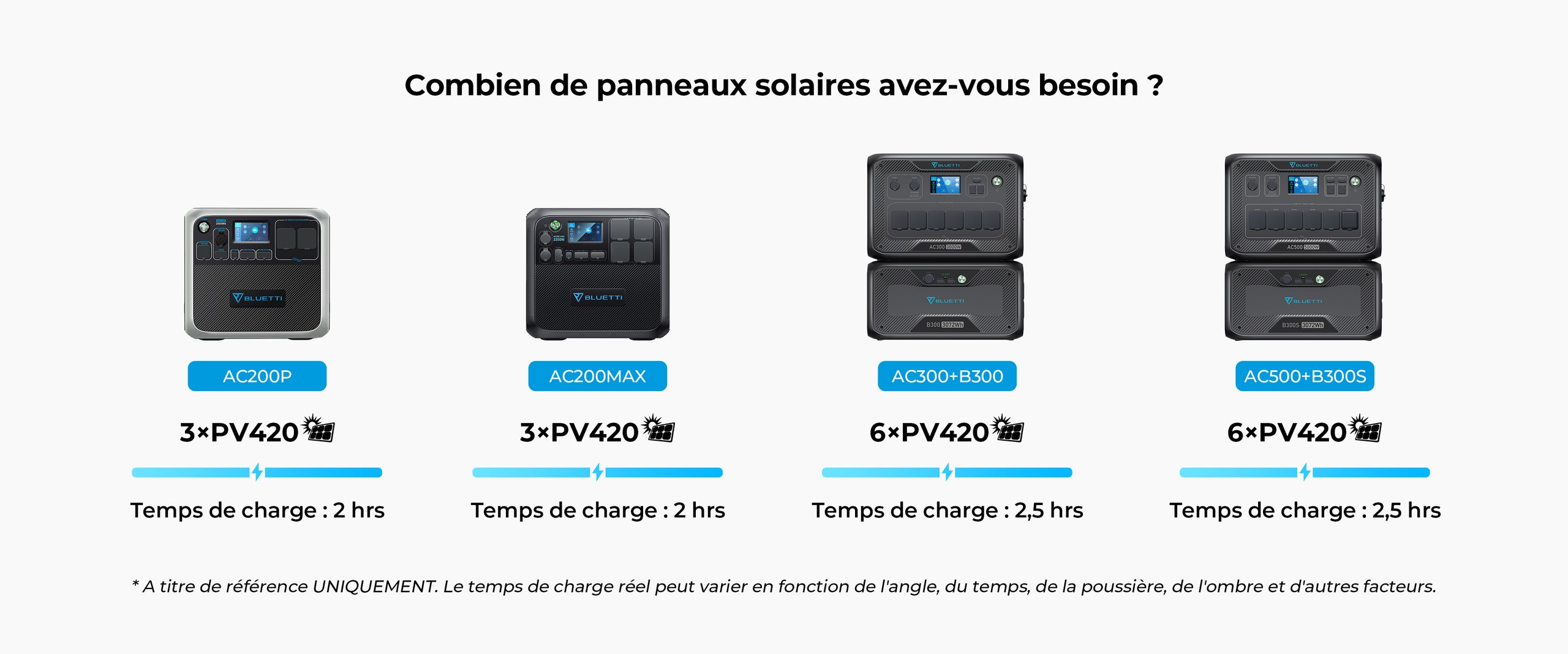 R:Non. En général, il n'est pas recommandé de mélanger différents panneaux solaires. Pour obtenir un système de panneaux solaires le plus efficace possible, nous vous recommandons d'utiliser des panneaux solaires du même type et du même fournisseur. Par exemple, deux MP200 chargeant des BLUETTI AC200P sont acceptables, alors qu'un PV200 + un MP200 n'est pas suggéré.