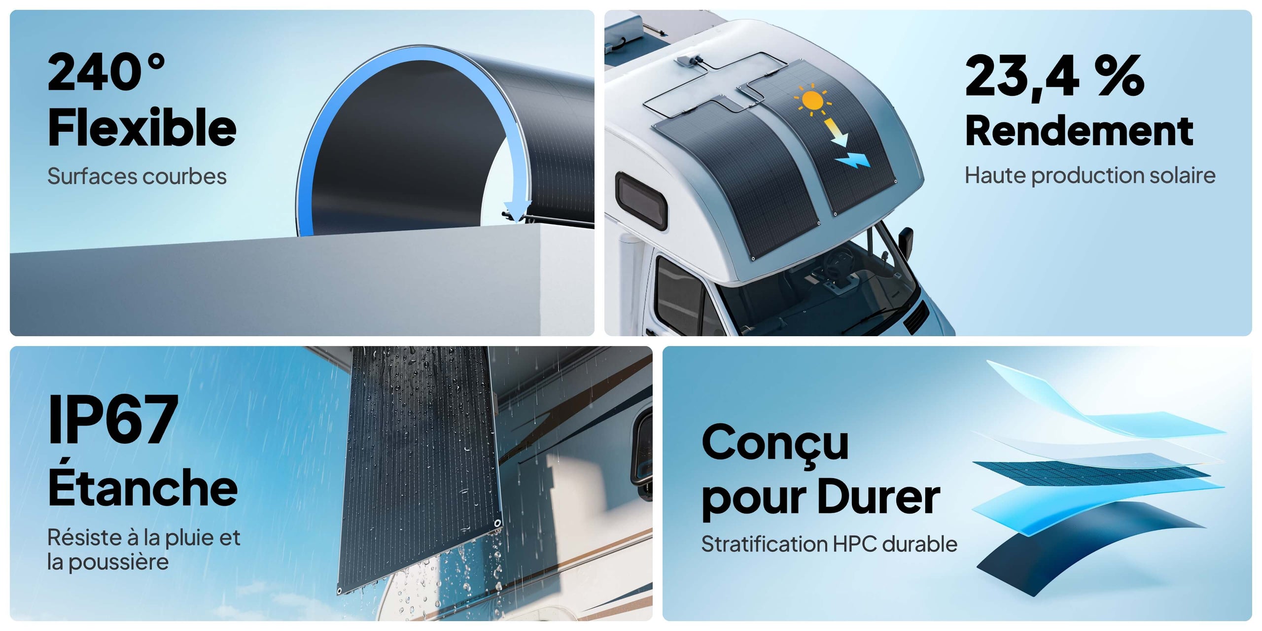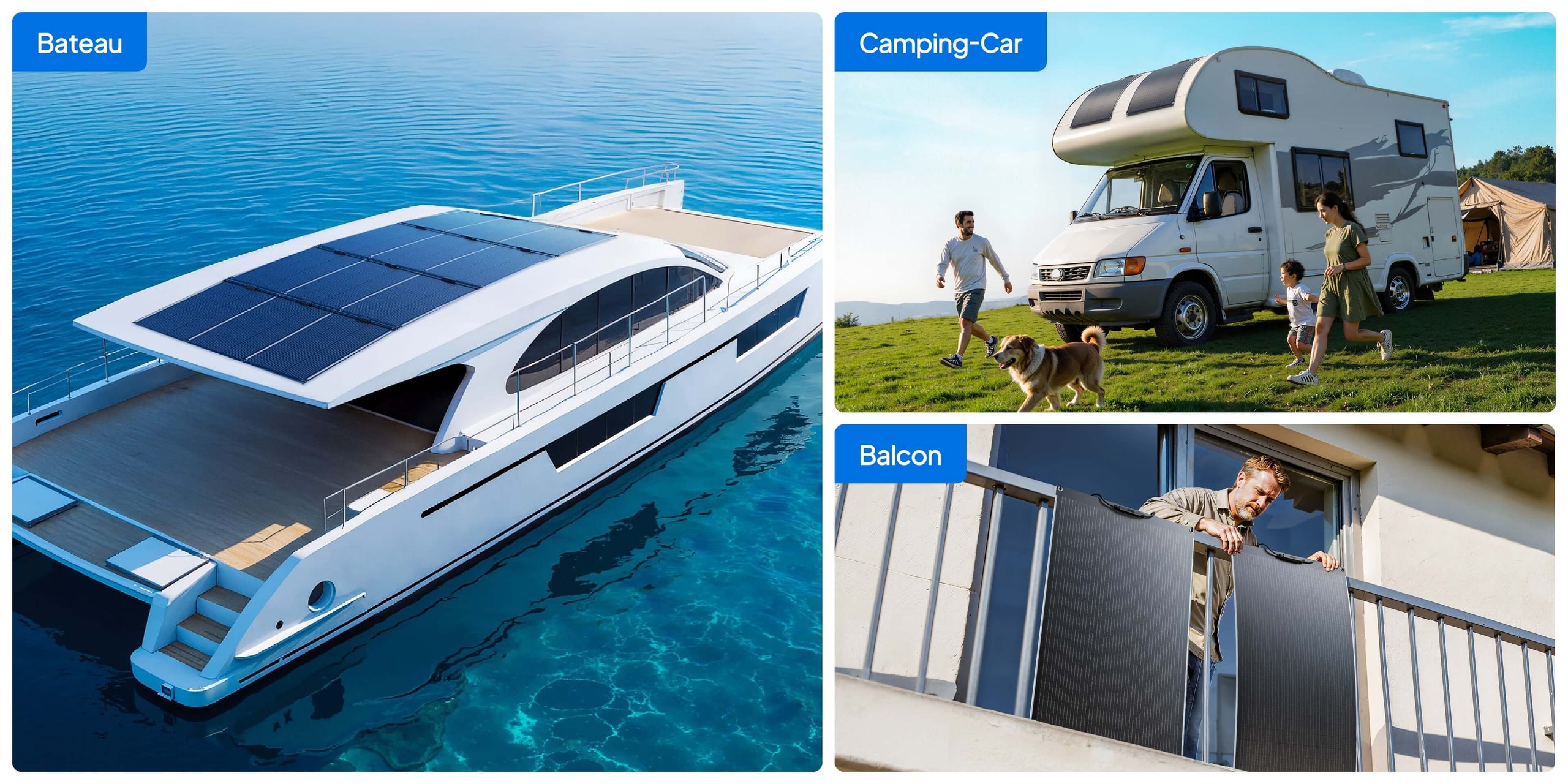 A:Panneaux flexibles : Légers, fins et pliables, idéaux pour les surfaces courbes comme les toits de camping-cars ou les ponts de bateaux.