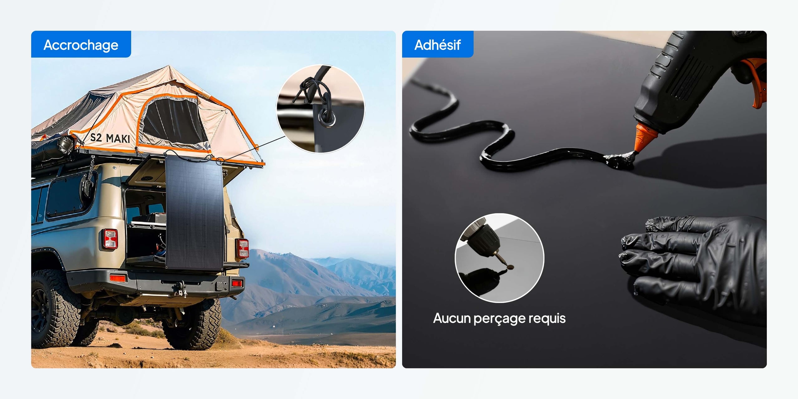 A:Utilisez de l’adhésif, des sangles ou des cordes à travers les trous d’angle pour une fixation sécurisée. Pour un guide pas à pas, regardez la vidéo Installation solaire pour camping-car sur la chaîne YouTube BLUETTI Support.